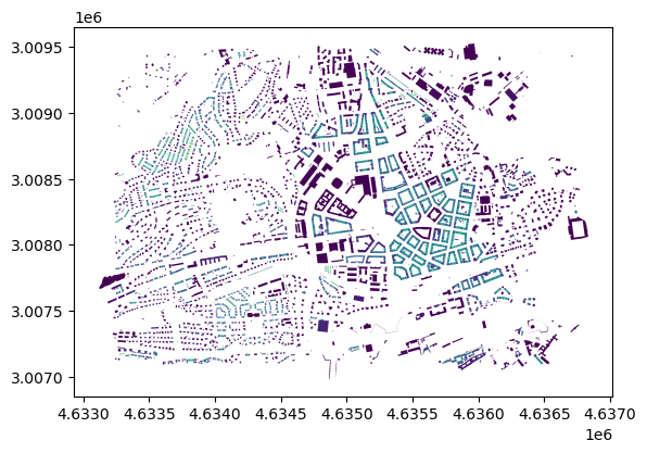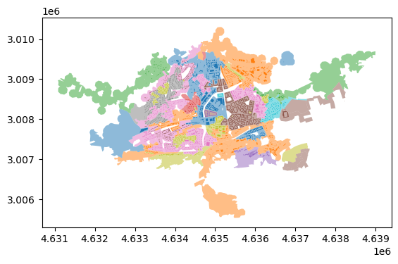 =new_clusters.fillna(-1), categorical=True) buildings_subset.plot(column