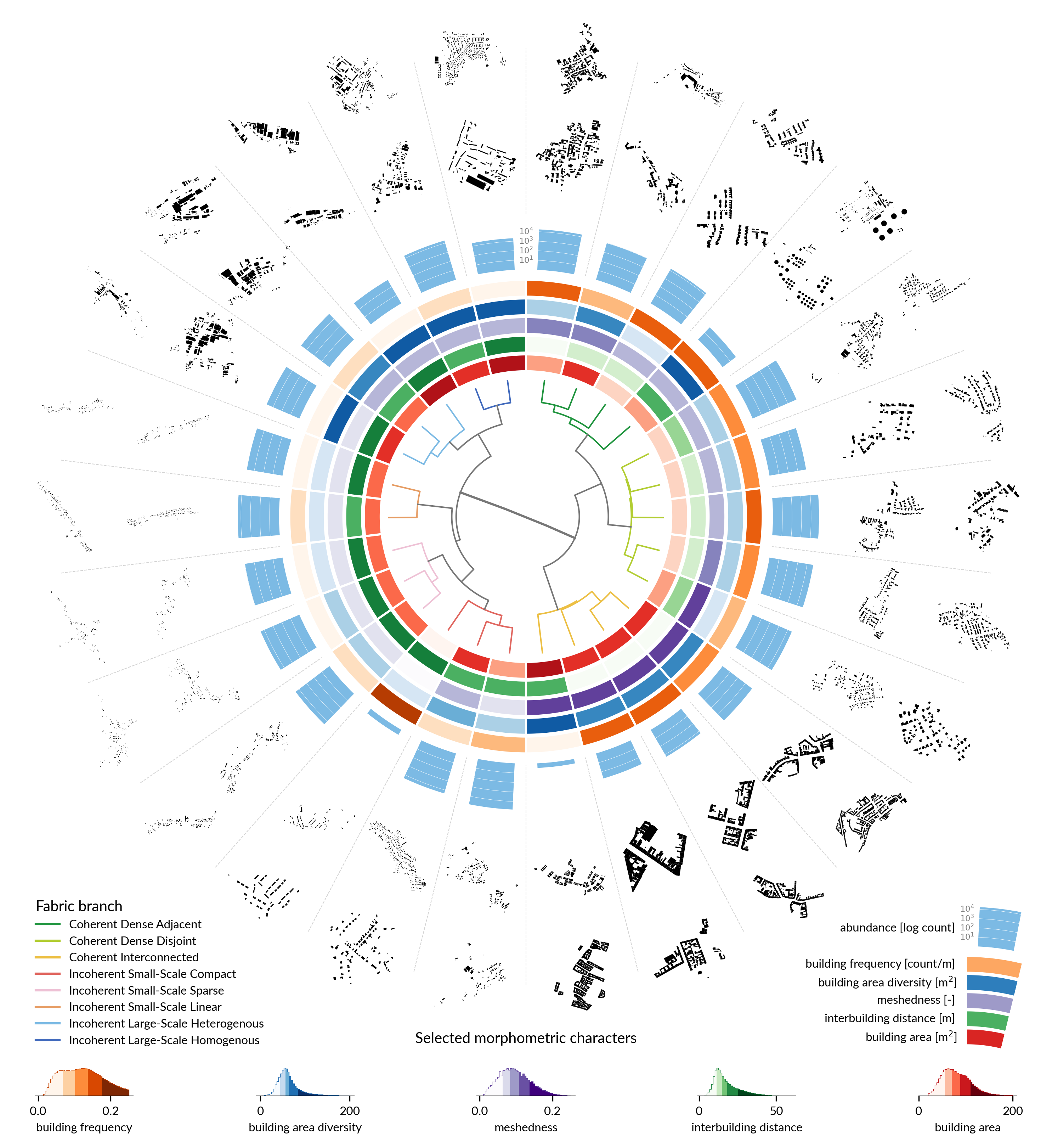Incoherent small-scale fabric is mostly non-urban development capturing various kinds of villages and small towns, which show high variation of morphological properties. Buildings tend to be smaller, but distances between them vary, as well as the relations between buildings and streets.