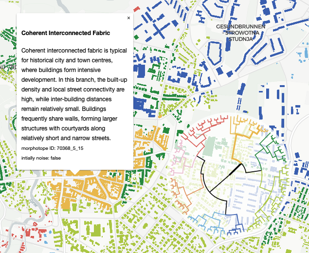 When you click on a building on the map, two things happen. First, you will see a popup with information about the branch (at level 3) that the building belongs to, including a short description. Second, the diagram showcasing the structure of the taxonomy in the bottom-right corner will highlight the specific branch (up to level 7) that the building belongs to.